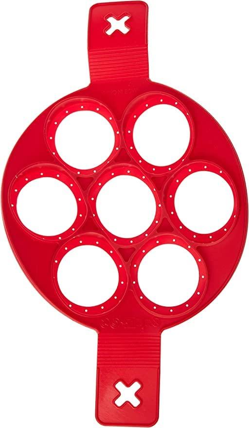 MAKES PERFECTLY SHAPED PANCAKES WITHOUT THE MESS, EASY FLIP GRIPS FOR SAFE AND EASY HANDLING. MAKES 7 PANCAKES AT ONCE