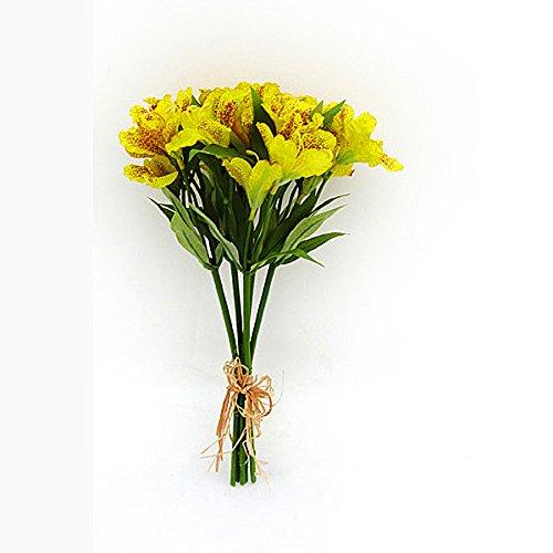 5 individual stems of faux silk artificial Alstroemeria (Peruvian Lily) flowers in Yellow, hand tied with raffia. 5 detailed and lifelike flower heads with leaves per stem. Ideal as a bunch or as individual flowers in an arrangement. 33cm (13 inches) tall in total. Flowers are approximately 7cm/2.5 inches in diameter. Stems can be cut if required. Actual colour may vary a little from the photo depending on your monitor settings. All sizes are approximate.