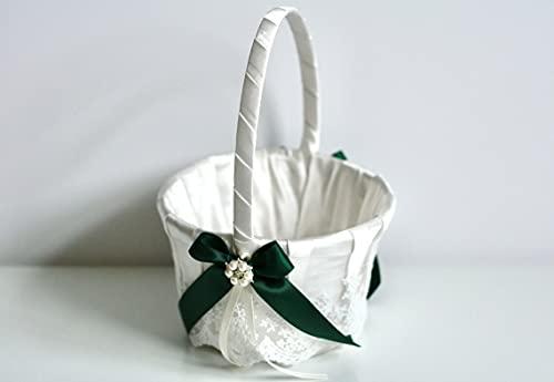 Flower Girl Basket Hunter Green, Ring Bearer Pillow Ivory and Lace Flower Basket, Wedding Ring Pillow Wedding, wedding flower girl baskets (Off-White, 1 Pillow + 1 Basket)