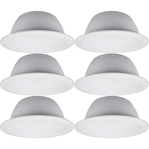 Four Bros Lighting Recessed Can Light Trim measures 7.25 inches in diameter. This stepped White baffle trim creates a smooth transition between the can and ceiling. The white color of the trim and matches ceiling color so it will create a balanced look that you will love. The oversized ring is used to cover gaps or damage to drywall to insure that you get that beautiful look that you want!