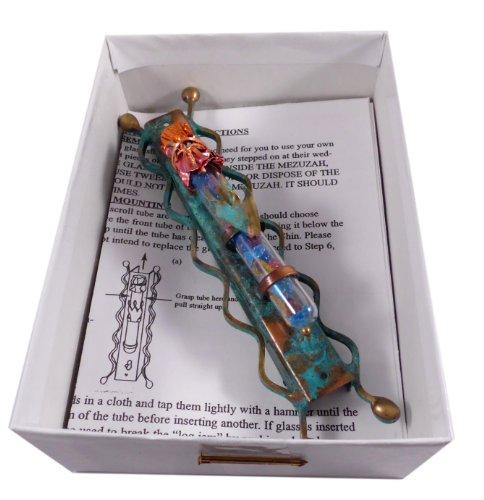 From our signature collection. Vial holds the broken shards of glass from the wedding ceremony, preserving the memory forever in this beautiful mezuzah. 1" width/ 5 1/2" length About the artist: Gary Rosenthal has been sculpting in welded metals for over 25 years. Together with a team of talented craftspeople he has created one of the most popular and unique lines of Judaic art in the country. By combining copper, brass and steel with brillant fused glass, the Gary Rosenthal Collection has a contemporary style rooted in tradition. His inspiration comes from the rich history of the Jewish people which tells us it's a blessing, a mitzvah, to make beautiful, functional art. Work from this collection has been presented to Presidents from Carter to Clinton and celebrities as varied as Bette Midler, John Travolta and Tony Randall. Rosenthal's collection can be found throughout the worlds many fine gallaries, private collections, and the following museum shops: Smithsonian's Renwick Gallery, Corning Museum of Glass, American Craft Museum, B'nai B'rith Museum, The Jewish Museum, Skirball Museum of Culture, and the John F. Kennedy Center for the Performing Arts.