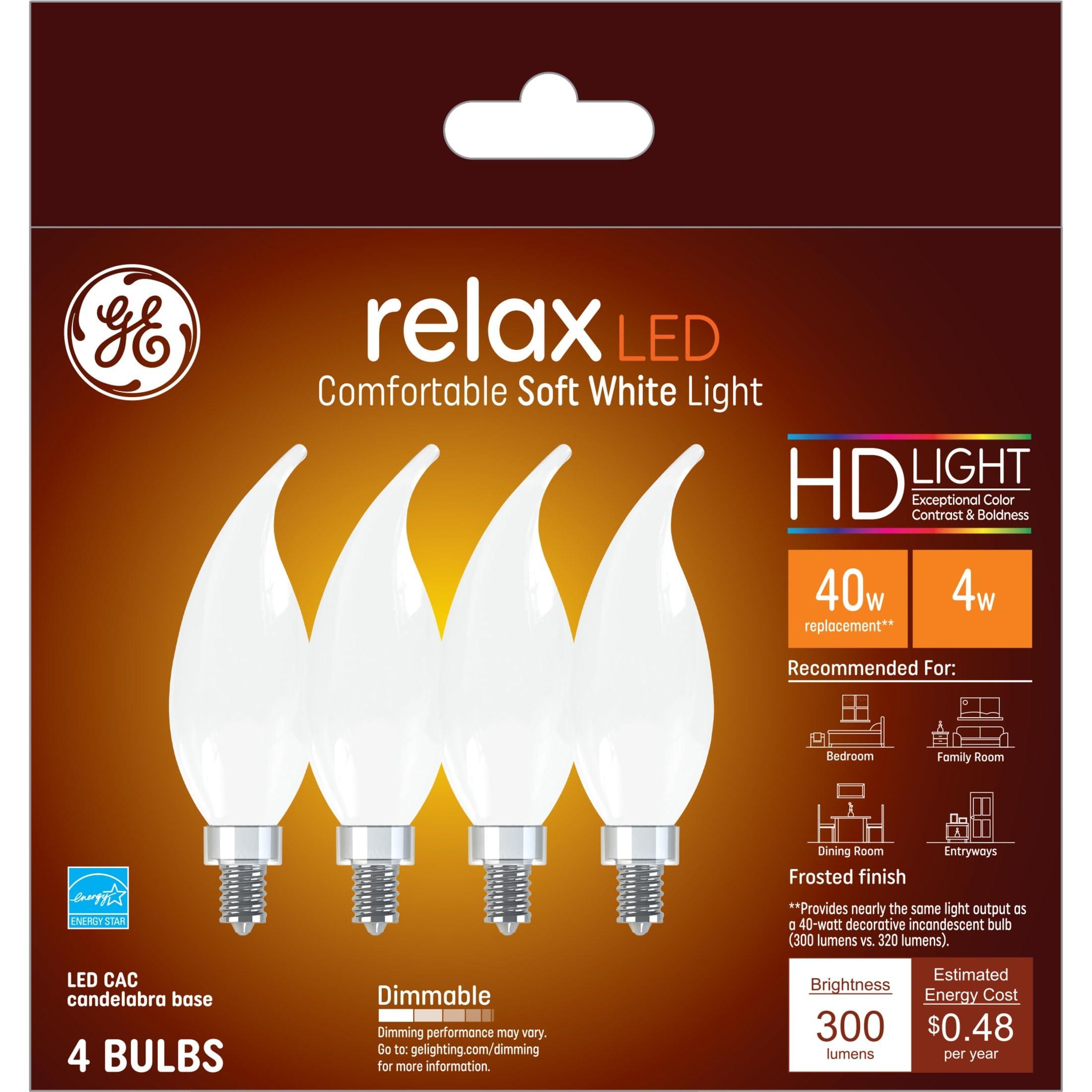 - Warm relaixing lighting: Relax HD LED light bulbs offer a warm, soft light perfect for comfortable moments and cozy spaces. Use these candelabra light bulbs in spaces like bedrooms, family rooms, and dining rooms.