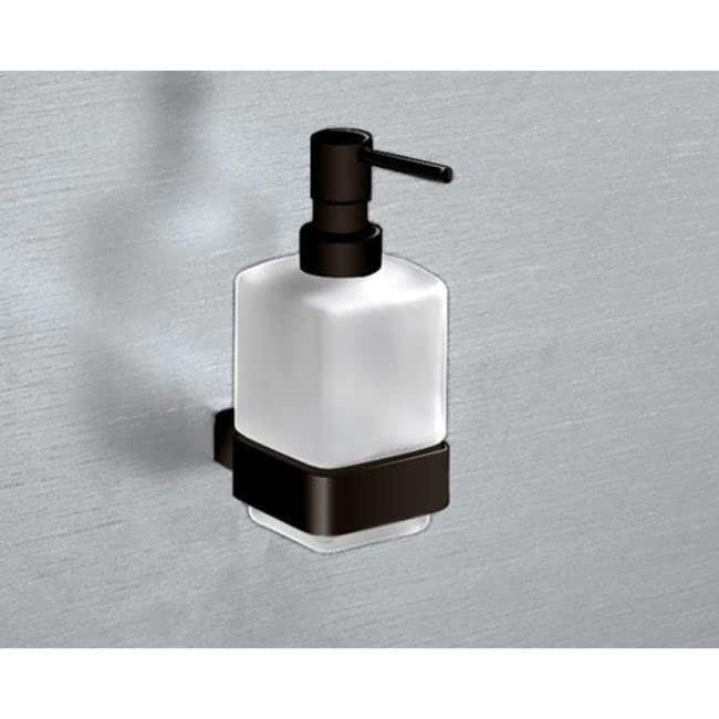 Contemporary, decorative wall mounted square soap dispenser. Gel dispenser container is made from frosted or satin glass. Hand lotion dispenser pump and wall mount are made from brass in a matte black finish. Made in Italy by Gedy. Contemporary, decorative wall gel dispenser. Made from frosted or satin glass. Pump made from brass available in matte black finish. From the Gedy Lounge Collection.