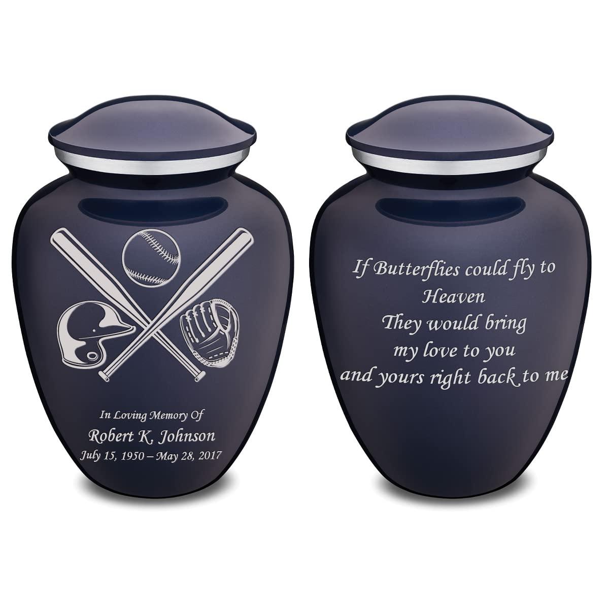 Honor the memory of your loved one with the Embrace Baseball Cremation Urn for Ashes. This beautiful urn represents a celebration of a loved one and their favorite sport. This is the perfect resting place for a baseball enthusiast. This gorgeous urn also has the option available for custom engraving to offer personalized tribute. Type up to three lines of text with any of our available fonts. Note: all custom engraved text is final and will be engraved as submitted. Medium Embrace Urns are simple yet elegant in their design; drawing from the classic urn silhouette combined with modern motifs. A Medium Embrace Urn is 44 Cu Inches (appropriate for sharing). Size: Medium Urns Dimensions: 6"H x 4.5"D Capacity: 44 cu. Inches Material: Alloy Opening: Threaded lid Velvet Bag: Not Included