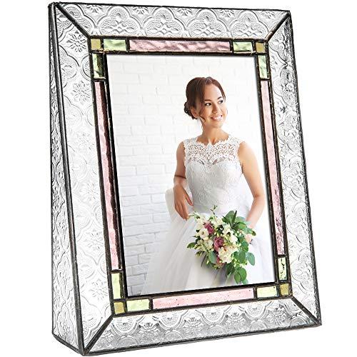 Combining clear glass with an embossed vintage texture with pieces of sage green, pink rose and pale amber in a craftsman style it has become one of our most popular collections. Several sizes are available in this signature collection from J. Devlin and look stunning paired together. Add a cherished photo and this frame will make any wedding or anniversary gift unique and personal. This 5x7 vertical (portrait) picture frame features glass sides providing stability and style unique to J Devlin frames. It is ascetically pleasing from all angles and your photo can be easily inserted into the back. This handcrafted stained glass picture frame has been made with lead free solder to protect you and the environment. An antique charcoal patina and wax have been applied to the metal trim and solder. Polish with a soft dry cloth if necessary. Each picture frame is carefully handcrafted by skilled artisans using a copper foil and solder technique developed by Louis Comfort Tiffany in the late 1800s. This age-old art form combined with 21st century designs creates the perfect combination for unique home dcor.