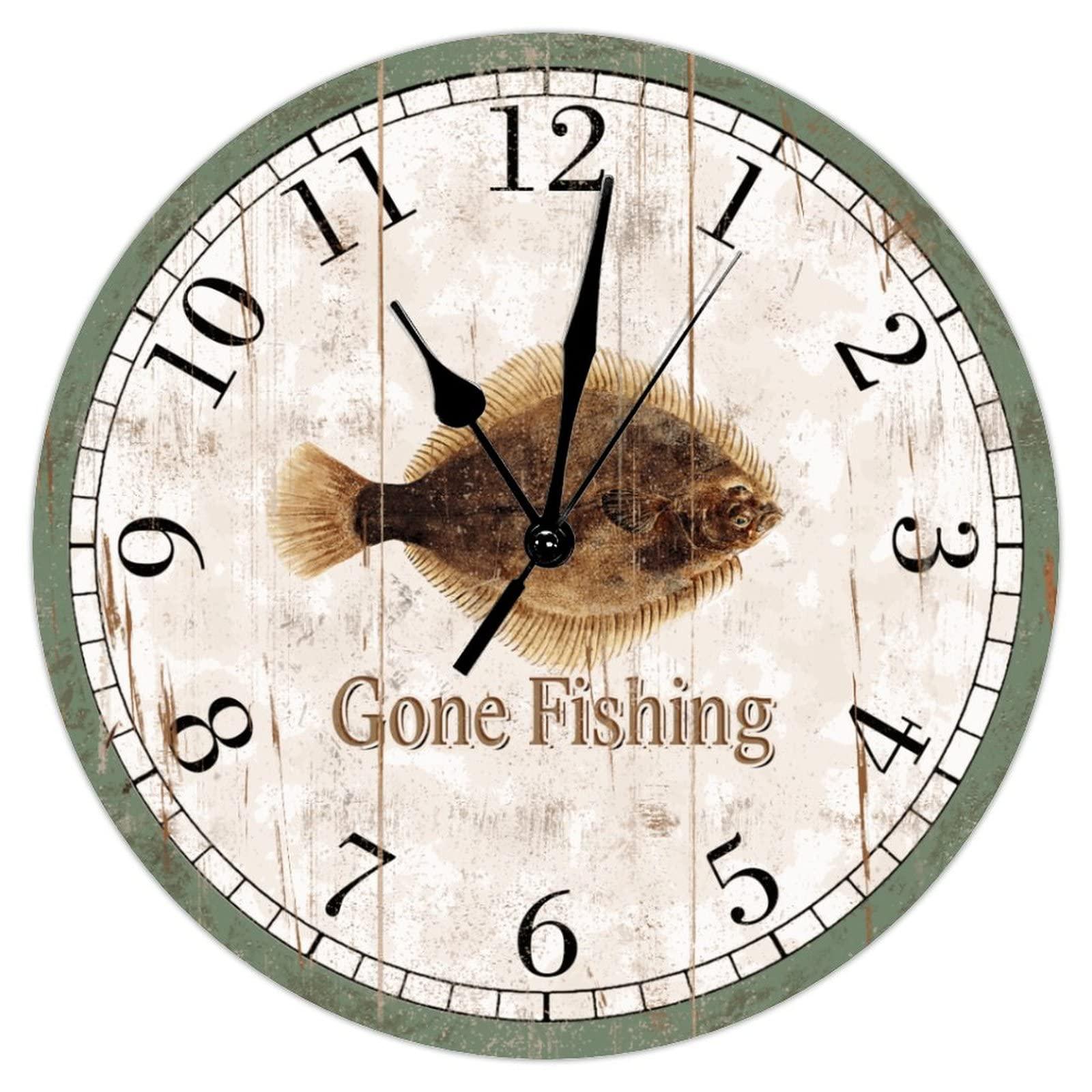 ArogGeld Go Fishing Wood Wall Clock Greenback Flounder Beach Decor Ocean Coastal Wall Clocks Quartz Battery Operated 12Inch Clock Rustic Farmhouse for Kitchen Bedroom Office Birthday Housewarming Gift