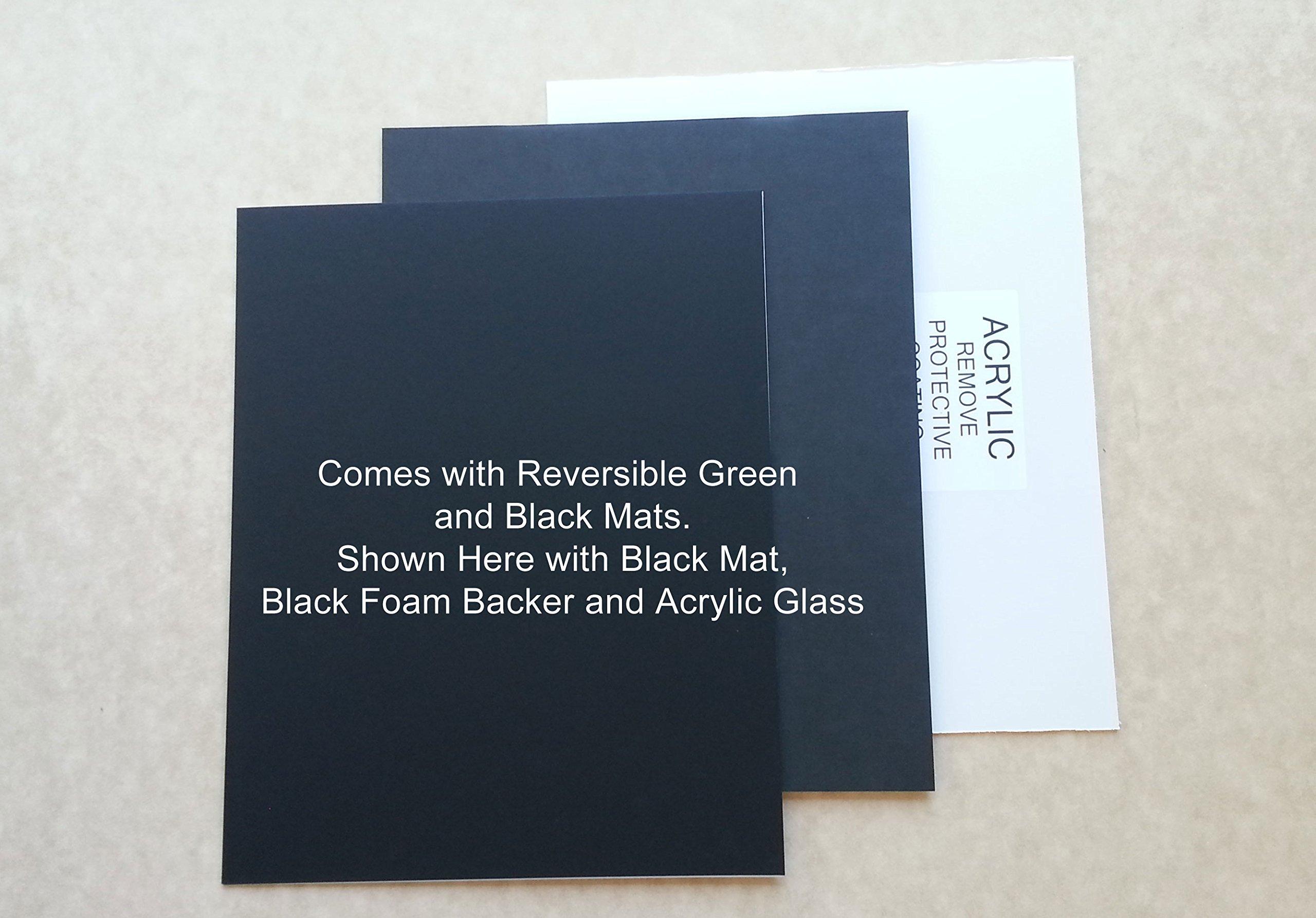 - It includes reversible black and green matting to mount your flag, fabric adhesive, acrylic glass, foam backing, bendable tabs for easy frame access, sawtooth hanger, bumpers and mounting instructions