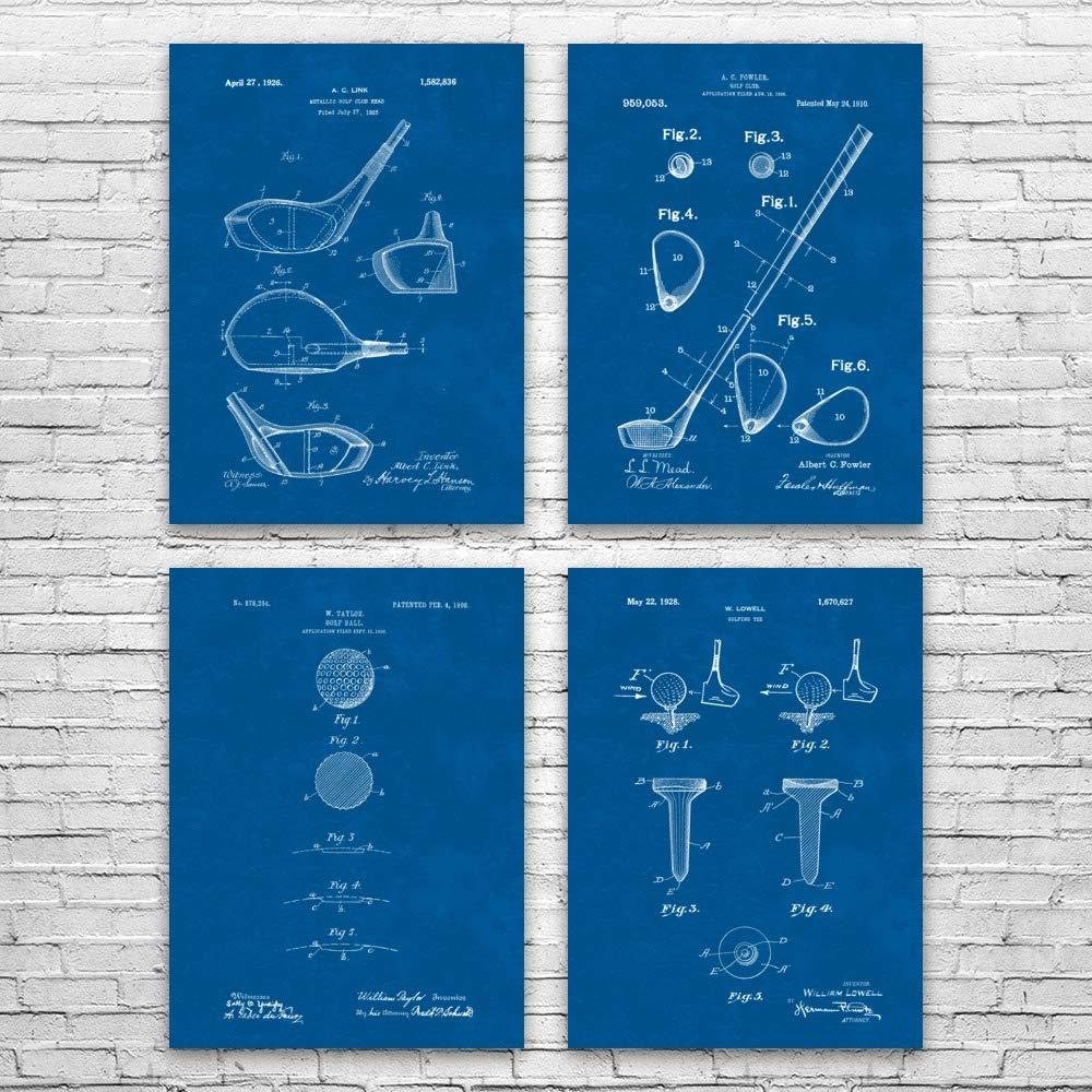 - Set of four 8" x 10" poster prints featuring Golf Patent designs on a Blueprint style background. Designed by Patent Earth, this wall art is made to order and customized with your choice of size and background!
