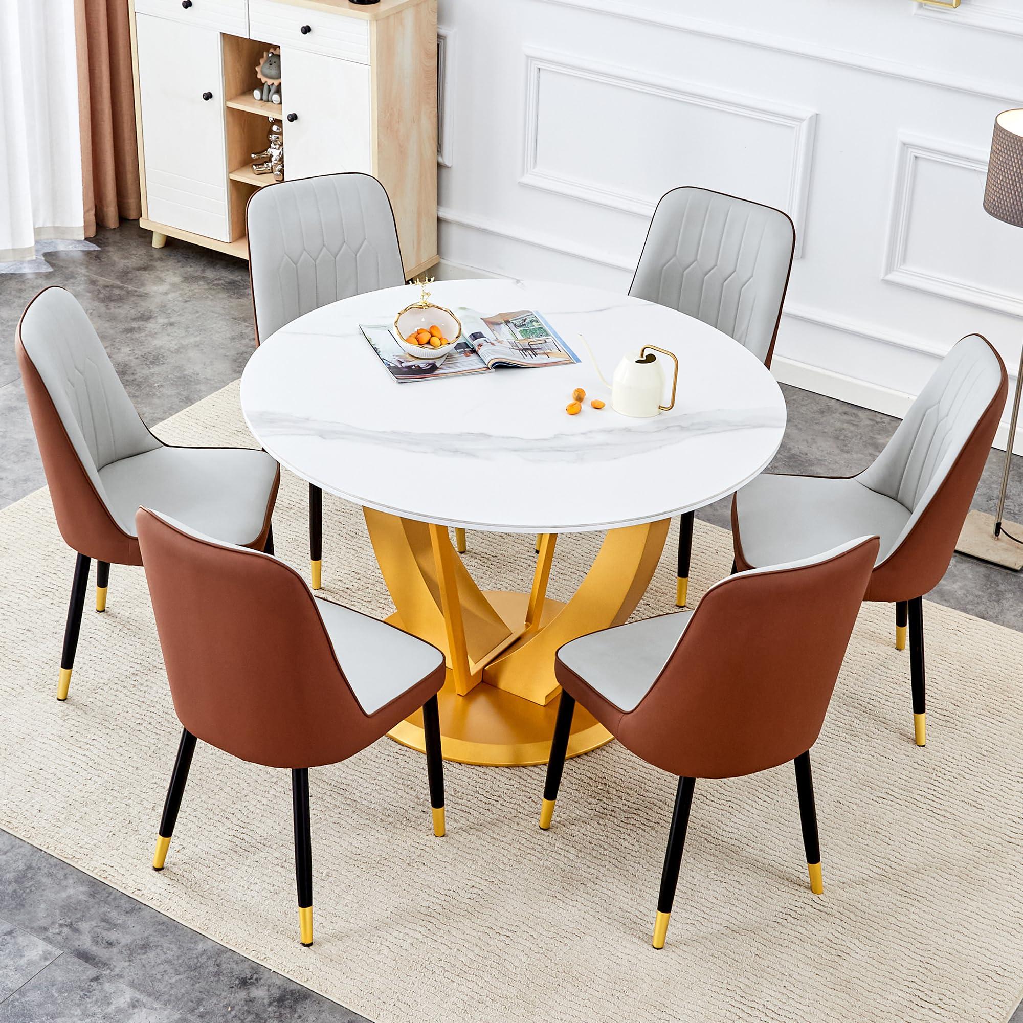 - Round Dining Table Set for 6The Round Dining Table Set includes somes chairs that evoke a modern vibe, featuring PU cushioned seats with backrests for ultimate comfort.The contrasting metal legs not only add stability but also a timeless, chic look.The table and chairs are supported, ensuring large load-bearing, the table can load up to 500 lbs and each chair can load up to 300 lbs.