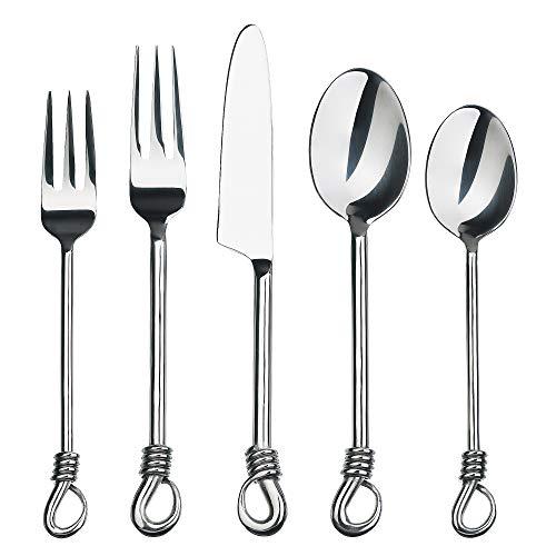 With 20 pieces in all, this Twist set includes four place settings, each with a salad fork, a dinner fork, a knife, a soupspoon, and a teaspoon. Safe in the dishwasher, it keeps its finish without polishing and carries a 50-year warranty. --Emily Bedard