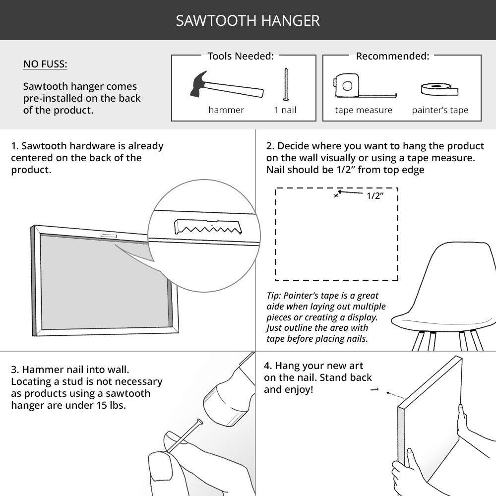 - READY TO HANG: Framed print comes with pre-installed hanging hardware already attached to the back of the product, so all you need to do is follow the included instructions to hang it on your wall. Items 16"x24" and smaller should have a sawtooth hanger, while bigger sizes have brackets. Infographics for hardware shown in product images.