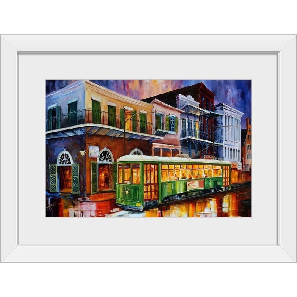 Framed wall art print entitled, "The Old Desire Streetcar." Vibrant contemporary painting of iconic landmarks in New Orleans in bright colors.