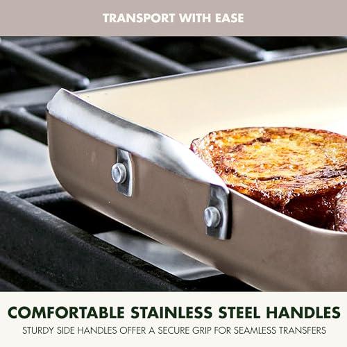 Designed with a thick aluminum base for fast and even heat distribution, this spacious Rio double burner griddle offers plenty of room for big family spreads, short-order classics, and so much more. This pan features our signature healthy ceramic nonstick coating for effortless nonstick release without PFAS, PFOA, lead, and cadmium. The riveted stainless steel handles offer a safe and secure grip that makes it easy to take your meals to the oven.