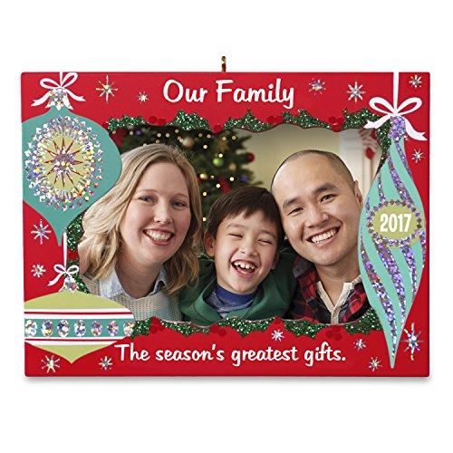 You'll want to find just the right cherished family photo to put in this fun and festive holiday picture frame ornament. Keep the same memorable photo in for all the Christmases to come. Or switch the picture out annually for a new photograph representative of a memory from the past year to hang on the tree. Festive and collectible, Hallmark Keepsake Ornaments come ready to give in a seasonal holiday gift box. The box can also be used for ornament storage. This Hallmark Keepsake Ornament measures 4.5 x 3.4 x 0.6 inches and comes in a 4 x 5 x 0.9 gift box. Dated 2017. Ornament is made of plastic and can be personalized with a favorite photo. Designed by Terri Steiger. Each piece includes one 2017 Our Family Greatest Gifts Picture Frame Dated Christmas Ornament in a gift-ready box. From preserving precious memories to commemorating special milestones, there's a Keepsake Ornament for everyone on your list. Hallmark has been your family-owned creator of greeting cards, gifts, gift wrap and more for over 100 years. We take deep pride in helping individuals connect in just the right way. This Hallmark original Keepsake Ornament features unparalleled artistry and exceptional detail. The ornament is lead-free and made for years of celebrations.