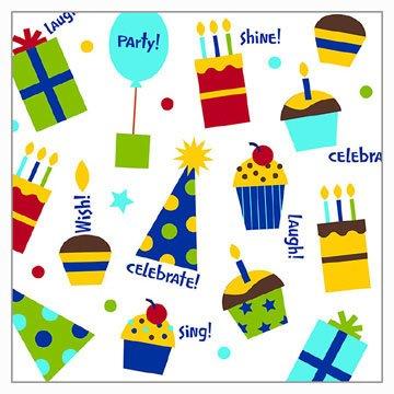 It's time to celebrate! Set the table for your birthday party with the perfect tableware using our Shine Celebrate Luncheon Napkins. Each 12.68'' x 12.81'' 2-ply luncheon napkin features cupcakes, cake, party hats, presents and balloons against a white background dashed with polka dots and stars. Sayings such as "Shine", "Celebration" and "Wish" are displayed on the napkins. Pair with our other Shine Celebrate tableware to achieve the perfect look for your party. 16 paper napkins are included per package.
