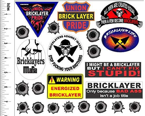 hard hat stickers, DESCRIPTION: This is a 9 pack of our top selling brick layer stickers with a bonus of 14 bullet hole stickers priced to give you maximum value. These stickers are made with the newest technology. The combination of premium 3-M vinyl and new resin printing technology produces the most advanced, water and UV resistant sticker in the world. These stickers can be used on any smooth clean surface such as hard hats, lunch boxes, tool boxes, lap tops, vehicle bumpers, tailgates, windows, coffee mugs, and the list goes on.