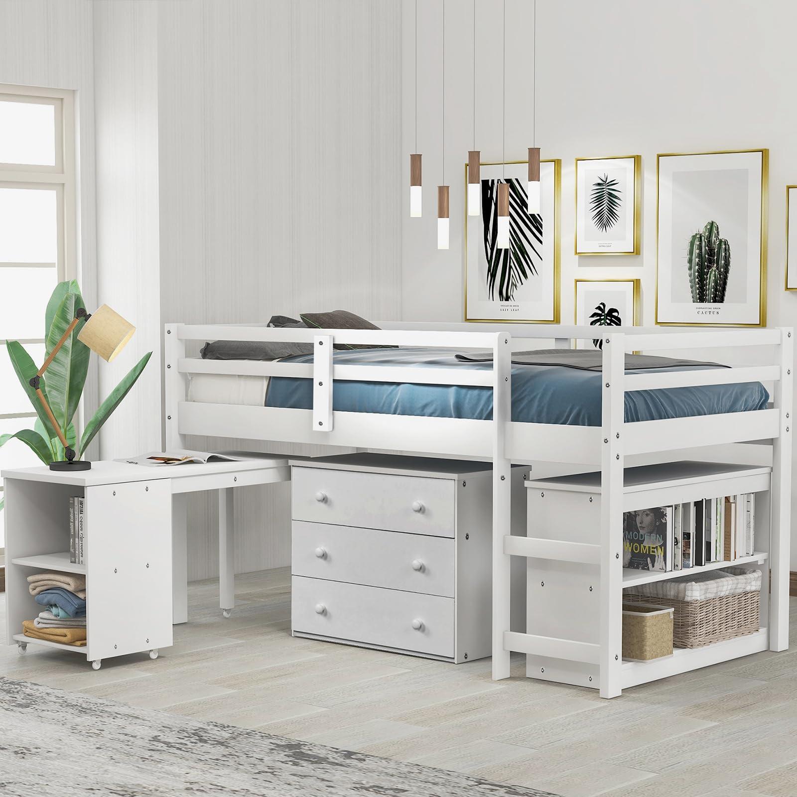 - Maximized Space Loft Bed Frame This low loft bed takes up minimal space for children. the 3 storage drawers, a 2-tier bookshelf and rolling portable desk are all under the low loft bed, Functional and aesthetic, this multifunctional loft bed provide plenty of storage options for your child to help keep their space tidy and organized