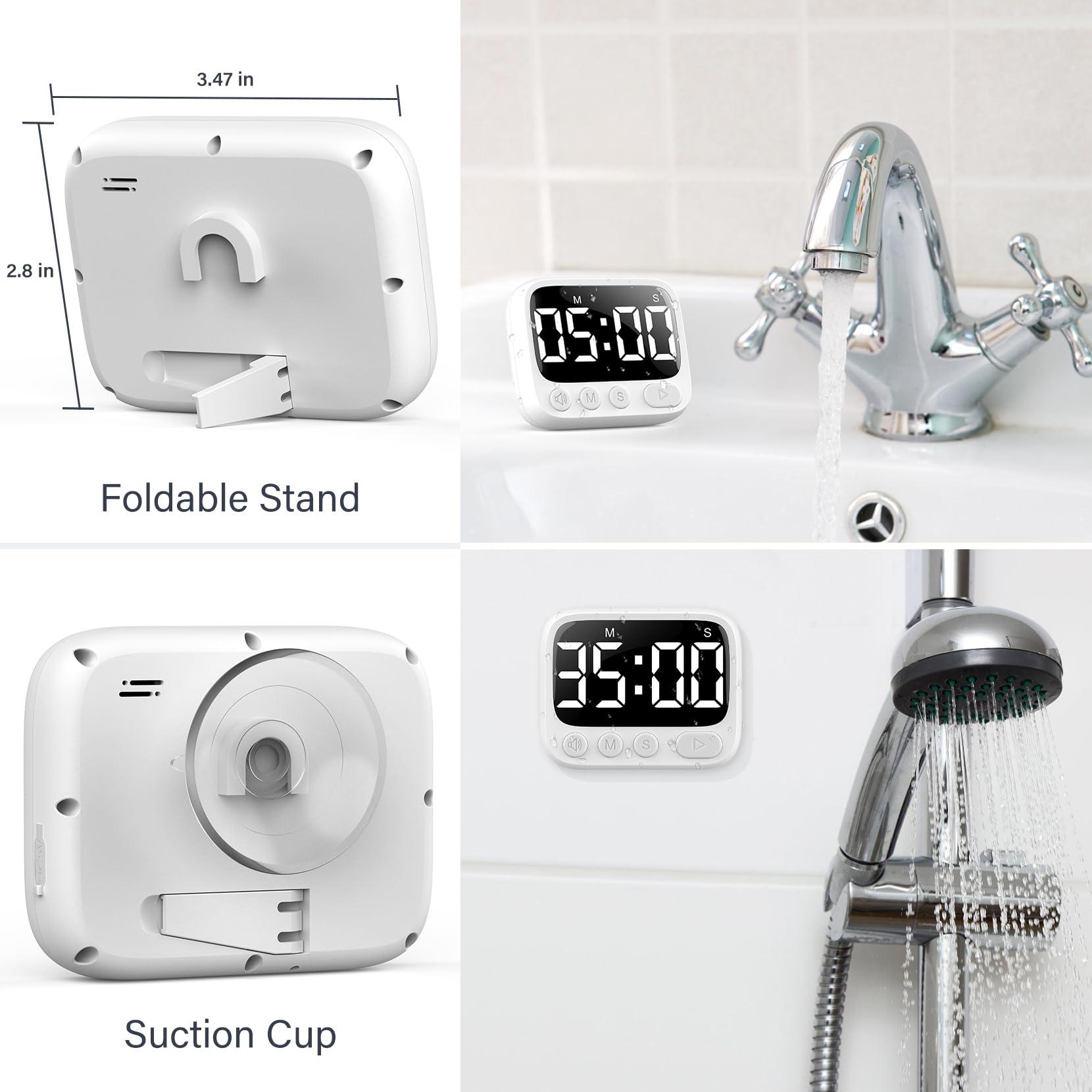 - Dual Timer Modes: With both countdown and stopwatch modes, a wide digital display ranges from 00-99:59, and a convenient foldable stand and a suction cup, this bathroom timer offers versatility and ease of use. Place it on your bathroom cabinet, window sill, or install it on non-porous & flat surface such as window/mirror/shiny tile wall/swimming timer with the included suction cup. Note: if you install it with the suction cup, please wipe the wall clean, try to apply some water on the suction cup to increase the adhesion, and press to remove the air inside the suction cup.