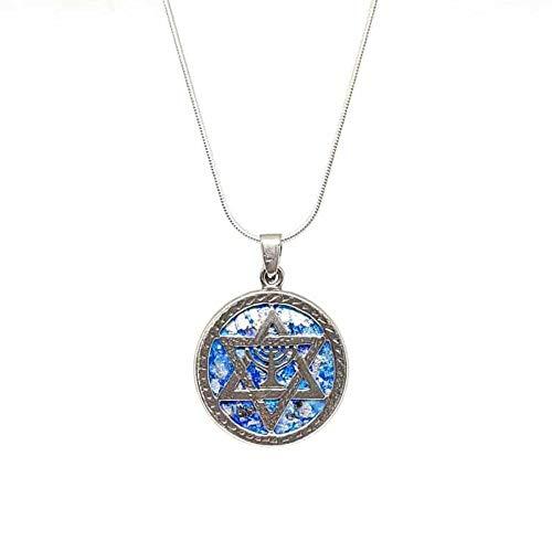 Beautiful Sterling Silver Roman Glass Menorah and Star of David pendant is by far one of the most original designs this is much more than only two triangles, The Star of David also known as the Magan David is believed to guard the bearer from any evil since King David himself used this symbol throughout all of the wars he won while conquering Israel. Included with the jewelry will be a certificate of authenticity stating the following: "This certifies that this piece of hand made jewelry is set with authentic 2,000 year old Roman Glass manufactured by the ancient Romans in 2 b.c. The glass was found in archaeological diggings throughout the Holy Land. It is authentic and is certified as a genuine antique." The handmade carved out lines on this unique Star of David pendant add an oriental finish to this fine piece of art Diameter is 0.84 inch This Star of David Pendant comes with a 16 Sterling Silver snake chain. The item is packed as a gift in a nice box Made In Israel
