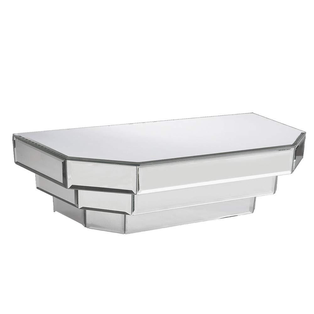 This floating shelf is a contemporary piece featuring stepped mirrored layers. Each mirrored panel is beveled adding to its style and beauty. Because it is mirrored, it beautifully displays and reflects each piece you put on it like a showcase for art. The shelf is a perfect accent piece for an entryway, bathroom, bedroom or any room in your home. Hardware is affixed to the back of the shelf so it is ready to hang right out of the box.
