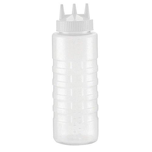 These squeeze bottles with caps have three tips to provide fast, efficient application. The plastic containers have a 32-ounce capacity. These squeeze bottle with caps have ribbed exteriors to provide easier gripping. The dispensers are translucent with a white top. The items are sold individually or in cases of 12.
