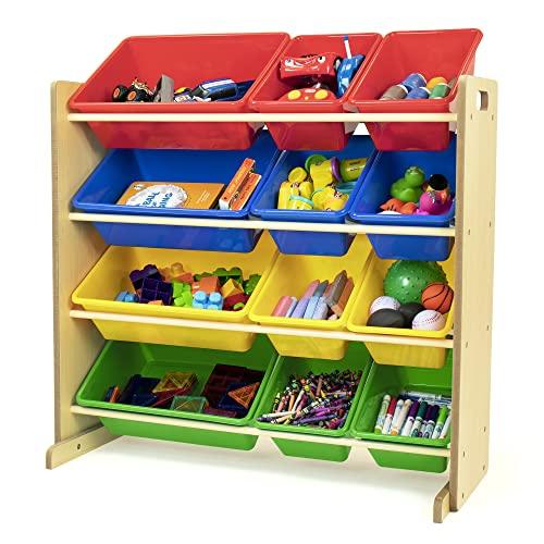 This space-saving Tot Tutors Kids Toy Storage Organizer with 12 Plastic Bins stores lots of children's toys in easy-to-see, easy-to-access plastic bins. The 8 standard and 4 large easy access storage containers are removable, making it fun for kids to take out toys, books, and games for playtime and quick to clean up after. This toy storage box alternative helps keep your little ones room clean while at the same time the bins can teach color identification as well as sorting and cognitive skills.