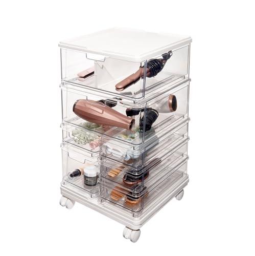 Created in collaboration with Sarah Tanno, the Global Artistry Director of Haus Laboratories and Lady Gaga's long-time makeup artist, The Sarah Tanno Collection by iDesign offers a curated collection of makeup organizers for your go-to products and tools. This stacking cosmetic organizer cart is designed with three small sized pull-out drawers, two medium sized pull-out drawers, and two large sized pull-out drawers on a locking rolling castor base with wheels for easy transportation. The small sized drawers are ideal for holding compact cosmetics such as powders, foundations, liners, lipsticks, ponytails, and much more. The medium sized drawers are great for storing your favorite palettes, hair brushes, nail polishes, perfumes, and more. The large sized drawers are perfect for storing your larger cosmetic supplies such as hair dryers, straighteners, curlers, sprays, soaps, and more. The integrated tray on top of the drawers offers convenient access to your most-loved essentials, while the transparent bins ensure items stored inside are always visible and accessible. Since this organizer is stackable and coordinates with other items from the The Sarah Tanno Collection by iDesign, customization is endless. The durable and eco-friendly BPA-free PET plastic construction with a sleek clear finish and matte white accents is made for long-lasting style and organization. Measuring 14.88" x 14.88" x 26.81", this 7-drawer organizer makes the most of your storage space in bathrooms, closets, by mirrors, or for on-the-go stylists. With the The Sarah Tanno Collection by iDesign, you can #LiveSimply every day.