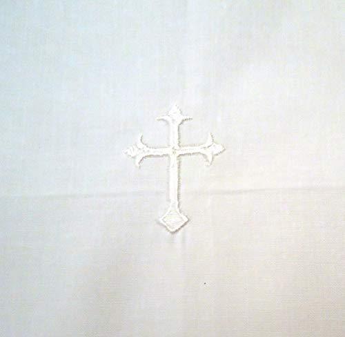 This is a fine 100% linen white eighteen inch square altar cloth with beautiful embroidered Latin style white 2 1/8 inch by 1 5/8 inch cross. Exquisite, 1.5 inch hemstitching on all sides. Classic and elegant, this cloth is designed to protect and cover sacred vessels during worship. Easy care instructions; machine wash cold, delicate cycle, air dry, press as needed.
