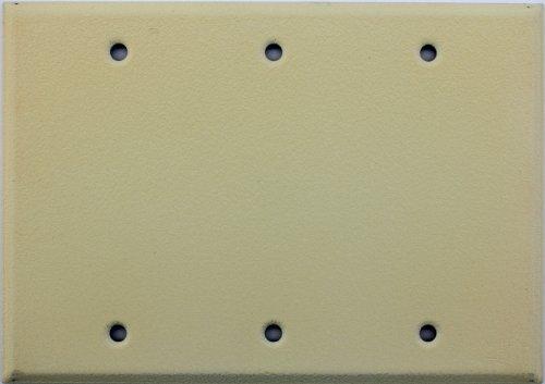 This three gang wall plate is a stamped steel cover plate that is painted ivory. It has a textured finish to the face of the plate so it can be easily painted, wall papered, or left as is. This plate has no openings. Use this plate to cover old electrical wall boxes that aren't used anymore. Plate measures 4 1/2" by 6 3/8"