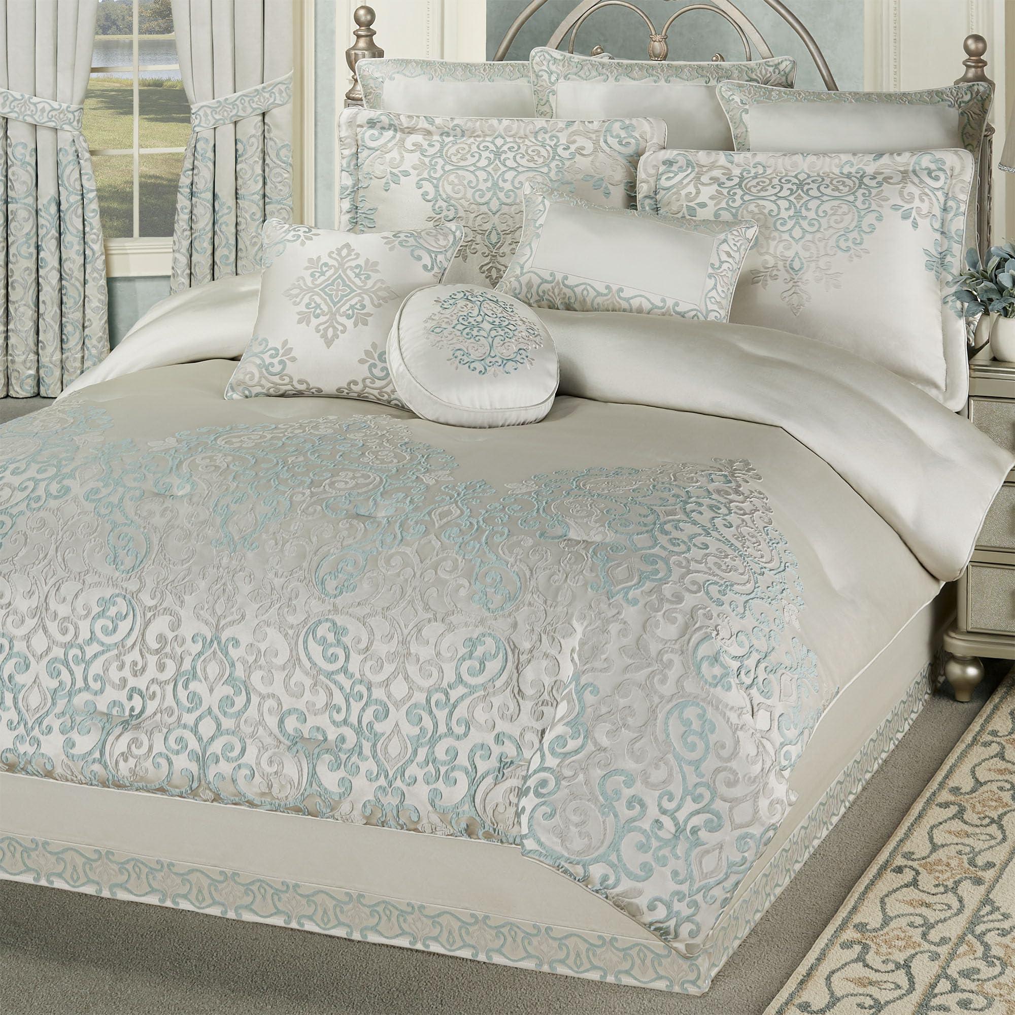 The Avalon Comforter Bedding showcases radiant beauty. Piped, oversized, polyester comforter features jacquard-woven scroll designs, fits mattresses up to 15 inches deep, and has a solid oyster polyester microfiber back. The tailored, solid oyster bedskirt has woven scrolls, split corners, and a 15 inch drop. Each king sham mimics the comforter and has flanged ends with piping and zipper closures. The three decorative pillows are traditional fashion accents for the bed or a bench in the bedroom. Piped rectangle pillow has a solid oyster center with a pieced woven scroll border, mitred corners, and a zipper closure. Round pillow has embroidered scrolls on oyster, piping, and a 2 inch side gusset. Square pillow has woven scrolls on oyster and piping. Colors are spa, silver gray, and oyster. Luxury bedding collection adds a high-end touch to a master suite or guest room. Set includes king comforter, 2 king shams, bedskirt, square pillow, round pillow, and rectangle pillow. King comforter is 110 inches x 96 inches; king shams are 20 inches x 36 inches each; bedskirt has a 15 inch drop; round pillow is 14 inches; square pillow is 18 inches; and rectangle pillow is 14 inches x 22 inches. Fill is polyester. Dry clean; spot clean pillows. Imported.