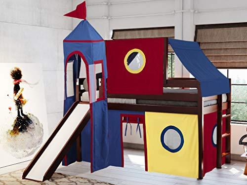 JACKPOT! Castle Loft Bed with Red and Blue Tent | Castle Bed in in a CHERRY painted wood | Includes Curtains, Top Tent, Tower and Slide | End Ladder can be positioned on the right or the left of the bed | Finish is child-safe | Solid wood including knot free New Zealand Pine - no particle board or mdf | No need for a bunkie board or a bunkie mattress as this bed comes with a complete set of slats | Assembly required with included tools | This is not a Bunk Bed - It is a Twin Loft Style Bed | SALE IS FOR LOFT BED ONLY EXCLUDES MATTRESSES | Total bed external dimensions are approx 87 1/2 high x 80 long x 84 3/4 inches deep. The twin loft bed on its own measures approx 49 1/4 high x 80 wide x 41 3/4 inches deep. Space under bed is approximately 32 high x 75 wide x 38 1/4 inches deep.