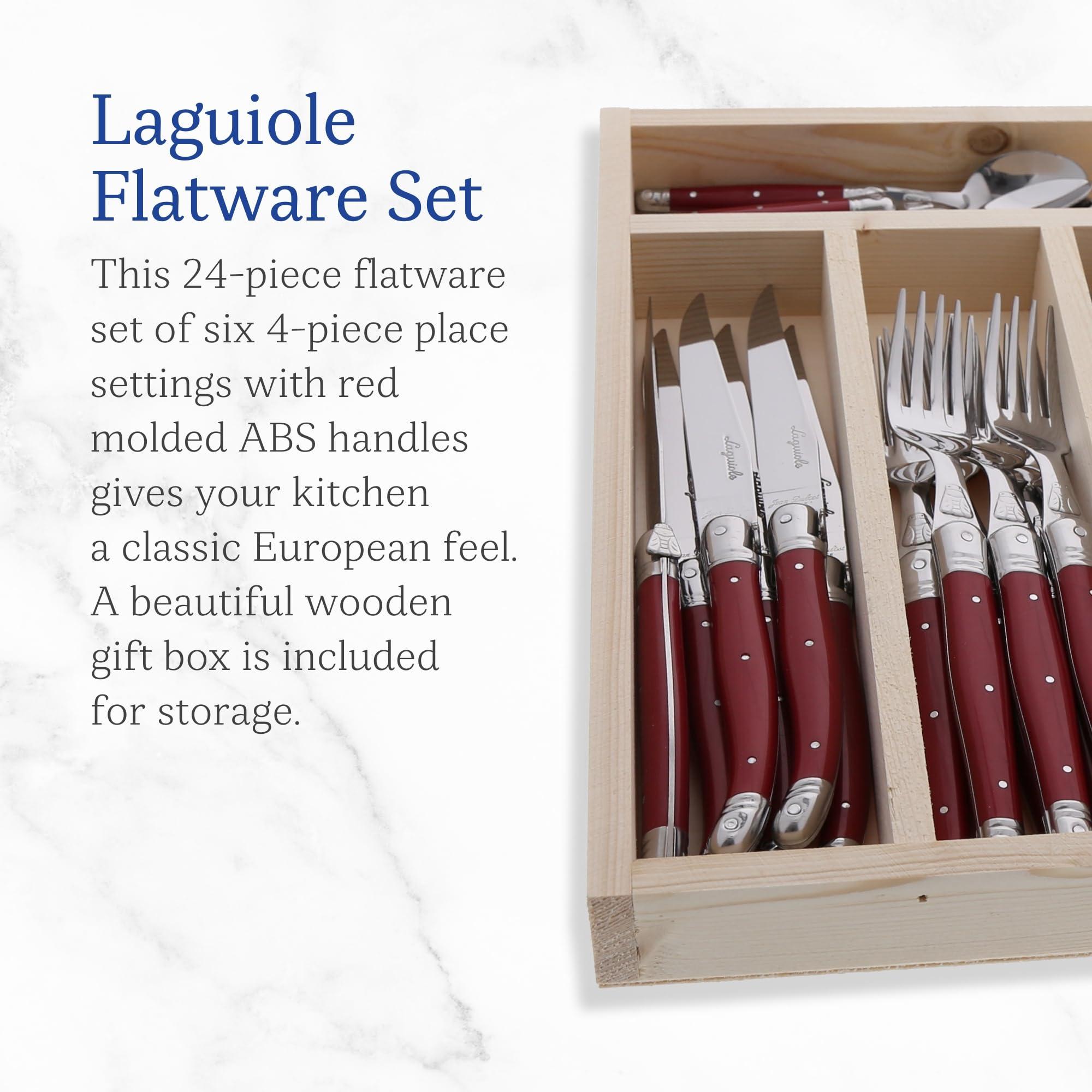 - EVERYDAY FLATWARE SET - Set the table in style with this chic Laguiole flatware set from Jean Dubost. This set features six knives, six spoons, six forks, and six coffee spoons, all with red ABS handlesadding extra flair that will delight guests.