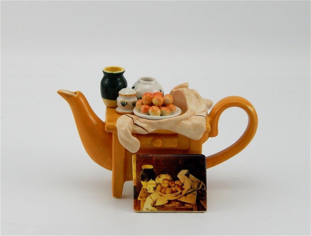 Jim Bailey designed large novelty teapots in conjunction with an English Pottery. As time went on he took his designs over to China and had them made in as a series of miniatures. Very creative designs and bright colors make these pieces so appealing to every teapot collector. This teapot features a table still life taken from the artist Cezanne and the painting that it inspired leaning against it.
