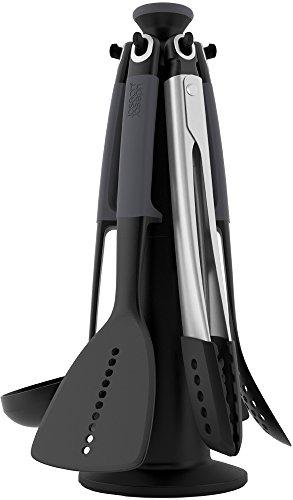 - 6-piece utensil set includes a solid spoon, slotted spoon, ladle, slotted turner, flexible turner, tongs, and a carousel storage stand