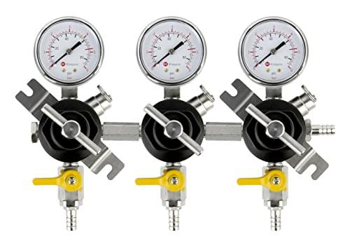 Kegco yh-76s-3 commercial grade triple gauge secondary regulator consistently delivers peak performance and is capable of handling the harsh conditions in commercial environments like bars and restaurants. Secondary regulators are used when you are attempting to dispense two or more kegs off of the same CO2 tank at different pressures. This secondary regulator has its own shut off valves and pressure adjustment knobs and can be mounted to a wall or the inside of a refrigerator. In order to use This secondary regulator, you will still need a primary regulator onto which one output will connect to the secondary with a piece of air line. Kegco regulators have a sturdy construction that ensures consistent flow pour after pour. This regulator features three T-Style adjustment valves that make it easy to adjust the keg pressure when the regulator is cold, three individual gauges on the regulator that indicate how much CO2 pressure is inside of the kegs, and three pressure release valves conveniently located on the regulator body.