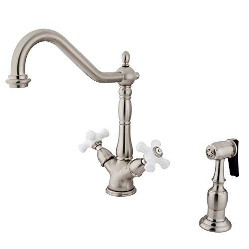 Included brass sprayer and a 8 in. deck mount setup with a 360-degree turn swivel hook spout. The handle moves in a 1 or 4-turn rotation for water volume control with a Max 1.8 GPM/6.8 LPM at 60 PSI. Classic style. Included brass sprayer. 0.25 turn ceramic disk cartridge. Porcelain cross handle. 8.62 in. spout projection with a 9-0.25 in. spout clearance. Single hole installation. Warranty: 10 years limited. Satin nickel finish. Made in Taiwan. True to its name, the heritage collection features aesthetic colonial elegance. the early American theme brings a timeless traditional design with graceful, yet attractive round curves and Victorian style spouts.