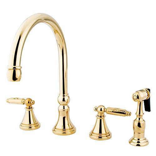 Kingston Brass KS2792GLBS Governor Widespread Kitchen Faucet with Brass Sprayer, Polished BrassTwo Handle Deck Mount, 4 hole Sink application, 8" to 16" Widespread, Solid Brass Side Spray, Fabricated from solid brass material for durability and reliability, Premium color finish resist tarnishing and corrosion, 360 degree turn swival spout, 1/4 turn On/Off water control mechanism, 1/2" - 14 NPS male threaded inlets, Ceramic disc valve, Max 1.8 GPM/6.8 LPM at 60 PSI, Integrated removable rator, 8-1/4" spout reach from faucet body, 12" overall height, Ten Year Limited Warranty to the original consumer to be free from defects in material and finish.Kingston Brass KS2792GLBS Governor Widespread Kitchen Faucet with Brass Sprayer, Polished Brass Features: 1/4 turn valves Ceramic disc cartridge 1/2" IPS inlets 8-1/4" spout reach 6-7/8" spout height Includes brass side spray Constructed from solid brass for durability and reliability Finished with a premium color to resist tarnishing and corr