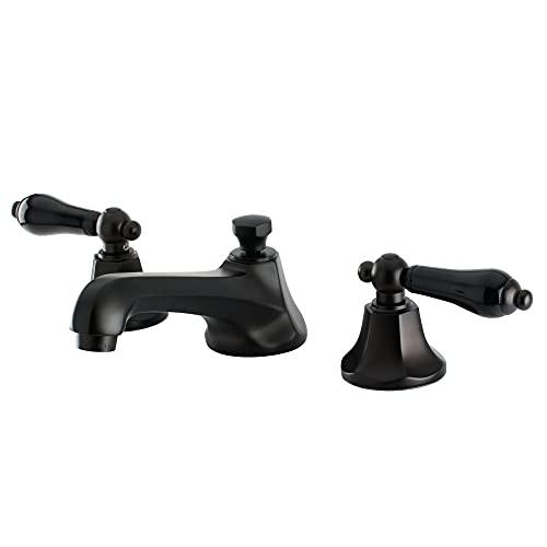 Includes pop-up drain. Traditional style. Premium black porcelain handles. Quarter-turn ceramic disc cartridge. Widespread faucet for 8 in. to 16 in. centers. Max 1.2 GPM/4.5 LPM water flow rate at 60 PSI. 5.5 in. spout reach. Made from brass. Oil rubbed bronze finish. Made in Taiwan. Explore a darker side of dcor with the iconic black porcelain handles featured on the metropolitan onyx widespread lavatory faucet. This faucet creates an elegant atmosphere in any bathroom combining its lustrous finish with the ebony on the handles. Extend the look of your bathroom and decor with matching accessories.