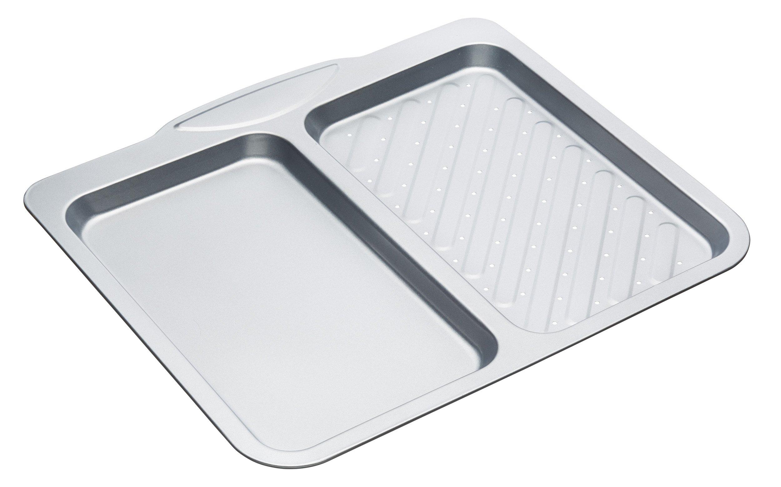 Life can be hectic enough, so keeping things simple when it comes to cooking can make all the difference. Fortunately, theres a split oven tray thats on a mission to make your life easier. With its handy divider, this tray lets you cook different food types at the same time. This means less hassle, less washing up, and more time to put your feet up. One side of the divided baking tray is a crisper. It boasts aerating holes and ridges which are ideal for crisping up chips, fish fingers and slices of pizza. The other side is smooth, providing a non-stick surface for cooking meat and veg.