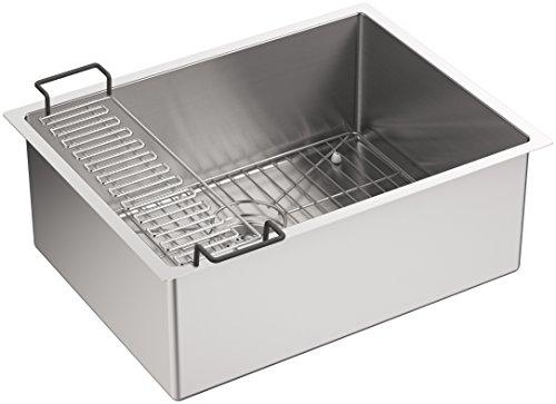 This Strive kitchen sink offers professional style with easy-to-clean curved corners. Made of thick, premium quality 16-gauge stainless steel, the medium-sized single bowl allows you to soak and clean large cookware and bake ware. Strive features a sound-absorption system that significantly reduces disposal and dishwashing noise. This sink includes a combination dishcloth bar and utility shelf to organize dishcloths, scrubbers and sponges and a bottom basin rack to help prevent scratches.