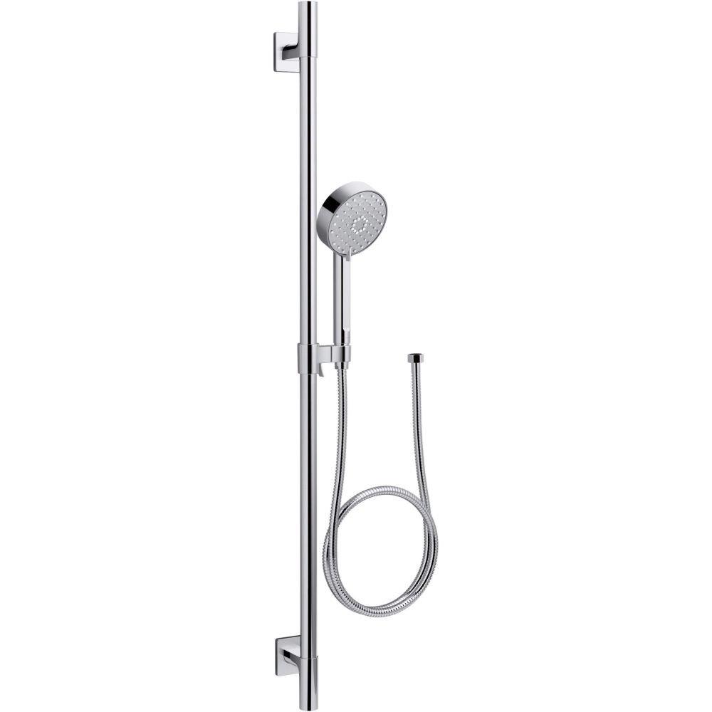 This all-in-one kit includes the Awaken G110 multifunction handshower, a 36-inch slidebar, and a 60-inch metal hose. Advanced spray performance delivers four distinct sprays - wide coverage, intense drenching, targeted massage, or reduced-flow spray - with a smooth rotation of a thumb tab. Ergonomic design makes for superior comfort and ease of use, with ideal balance and weight in the hand. The artfully sculpted sprayface reveals simple, architectural forms that complement contemporary and minimalist baths