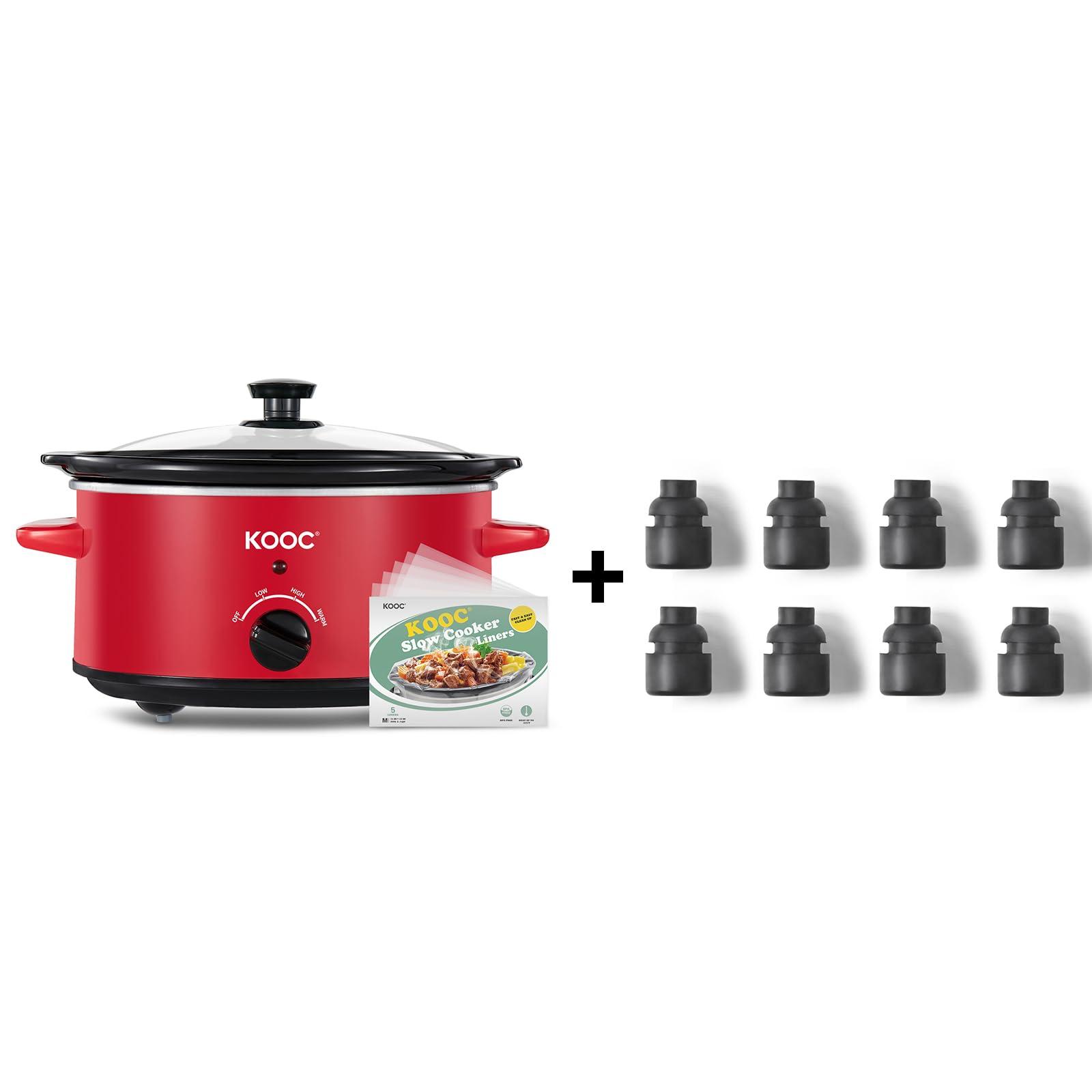 - [This product includes] 4QT slow cooker, comes with 5 liner, 8-pack of rubber feet