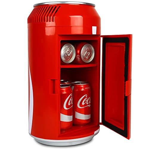 Convenient and refreshing : This 5.4 L/ 5.7 Quart compact mini fridge is the ideal personal cooler to keep your favorite Coca-Cola products chilled and ready to drink. It uses efficient, reliable thermoelectric cooling technology with no CFCs and is 12V DC/110V AC capable so you can plug into your vehicle or any household outlet. Perfect gift for collectors : The eye-catching red soda can design with official Coca-Cola graphics, recessed self-locking door, and pull-tab carry handle will make this beverage cooler a favorite showpiece for collectors to brighten up their dorm room, cottage, man-cave, trailer, or RV. Compact and safe storage : This mini cooler with removable shelf holds up to 8 standard 355 mL/12 oz cans. Chill your favourite soda or beer or safely store items such as yogurt, cheese, milk, cosmetics and medication at work or in your truck, boat, trailer, or RV. Tips and Tricks : For quickest cooling, pre-chill items before placing in mini-fridge and provide at least 3 inches clearance behind the fridge Minimize opening and closing and ensure door is closed properly for most effective temperature control Lowest possible temperature depends on surrounding ambient temperature To avoid draining your vehicles battery, only run cooler when the engine is on