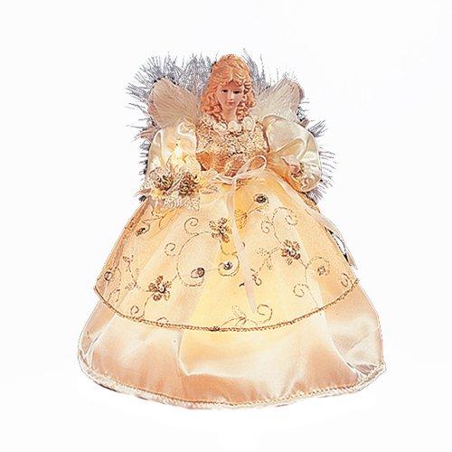 This Kurt Adler 10-Light 9" Ivory and Gold Angel Treetop is a beautiful;classic way to accent your Christmas tree. Dressed in a long;ivory dress adorned with gold trimming and detailing;this angel has white feathery wings;long hair;and lights up. This tree topper is for indoor-use only.