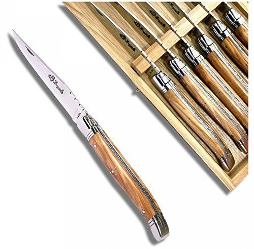 Steak knife total length : 23 cm Stainless steel blade : 2.5 mm thickness 2 Solid stainless steel bolsters Hand wash recommended Delivered with certificate of origin and guarantee 6 knives packed in an oak box The gold-satin finish of the wood handle can be maintained by the occasional rub with oil-soaked rags. The stainless steel bolsters need no upkeep. If the cutlery is put in the dish washer, the wood will need rubbing with a cloth soaked in oil.