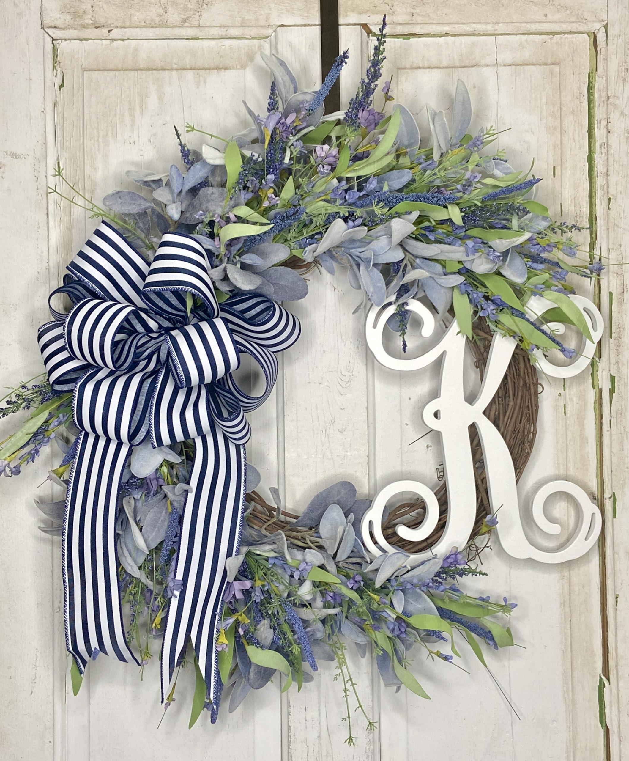 Lavender and Lamb\'s Ear Monogram Initial Front Door Wreath with Choice of Bow on Grapevine Base-Handmade in the USA