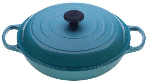 Le Creuset Signature Enameled Cast-Iron 3-1/2-Quart Round Braiser, Caribbean This updated kitchen classic enhances the cooking process by evenly distributing heat and locking in the optimal amount of moisture. With ergonomic handles and an advanced interior enamel that resists chipping and cleans easily, Le Creuset's braisers blend the best of the past with the latest innovations in comfort and functionality. Most braising recipes call for searing the meats or vegetables at a high temperature, then finishing covered on lower heat, creating a natural gravy. Colorful, long-lasting exterior enamel resists chipping and cracking; interior enamel is engineered to resist staining and dulling Sand-colored interior enamel makes it easy to monitor food as it cooks, preventing burning and sticking Oversized handles provide even weight distribution and a secure grip Ergonomic composite knobs are heat resistant to 500F Built-in lid stabilizers provide a secure, no-slide fit The lightest weight per quart of any premium cast iron cookware available Braising uses both wet and dry heats to break down tough cuts of meat and tenderize fresh vegetables