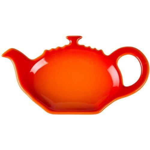 With a wide surface to hold multiple bags, this Le Creuset tea bag holder can also hold infusers and spoons while keeping your surfaces safe from spills. Made from dense flame orange colored stoneware, it blocks moisture absorption to prevent cracking, crazing, and rippling. Its durable exterior enamel protects the holder from marks and scratches, while the glazed interior is nearly-nonstick. Designed in the shape of a teapot, it is dishwasher safe and backed by a manufacturer's five year warranty. 5" L x 2-3/4" W x 1/2" H