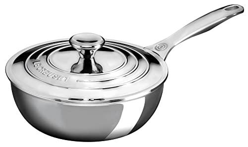A chefs favorite, the Signature Stainless Steel Saucier has a smooth contoured interior that is optimal for making sauces, risotto or sauting vegetables. Sloping sides and a rounded bottom facilitate stirring and whisking, and also make cleanup easier than ever. Radiant and durable, the triple layer construction features a full base-to-rim aluminum core for superior heat distribution, while the lightweight titanium-infused stainless steel exterior resists scorching and corrosion at higher temperatures. Innovative details such as interior capacity markings, iconic three-ring lid with built-in steam vents, and a dripless pouring rim save valuable prep time and make cleanup a breeze.