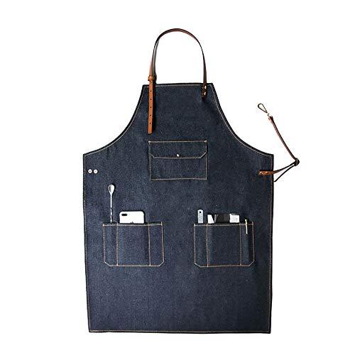 - VERSATILE TOOL POCKETS: Large, easy access tools/accessories leather or leather edge pockets in front .strong durable large hand-pocket.Cell phone/pencil pocket on front chest. Handcrafted Canvas Denim Unisex Apron With Back-Crossed Leather Strap